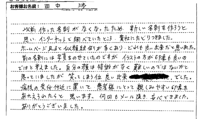仕上がりの似顔絵もよく出来ていて(ちょっと出来過ぎ?)友達に見せたら、突っ込まれそうですけど(笑)、初めて見る方への印象としてはとてもいい感じに仕上がっていると思います。似顔絵に負けないよう頑張ります!!