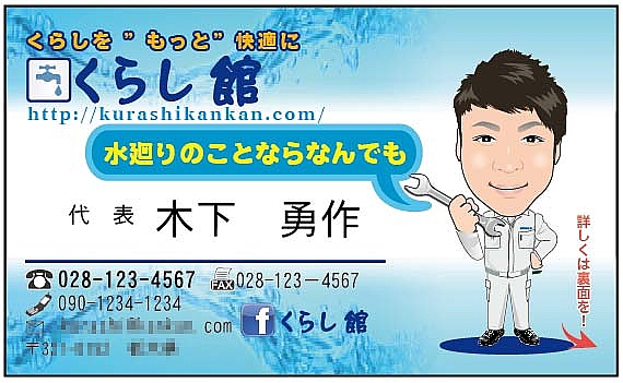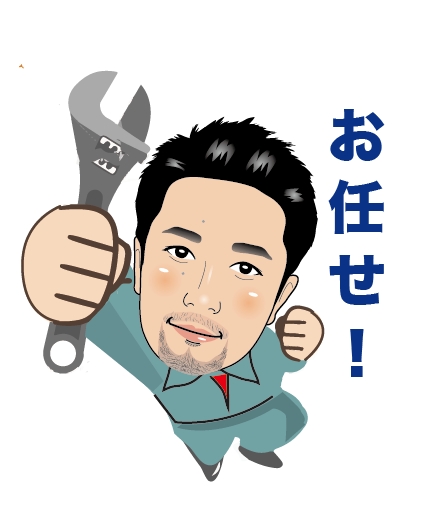 スパナを持って「お任せ下さい!」という元気な似顔絵です。