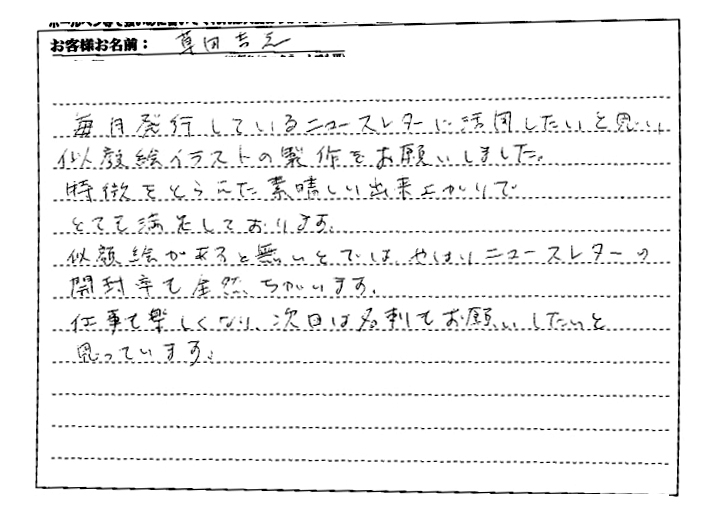 「絵柄が以前のものと異なったタッチ、発注のしやすさが、御社に決めたポイントです。」