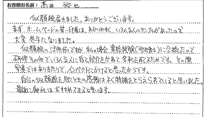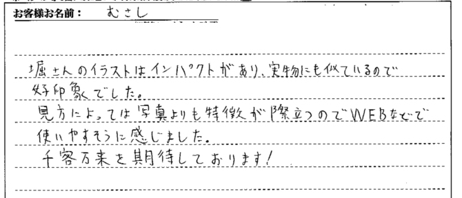 「HPや広告に似顔絵を使いたいなぁ。」と思っていましたが、似てないと困るし、あまり誇張されたのも困るけど、いい所あるかな?とネット検索していて御社に行き当たりました。