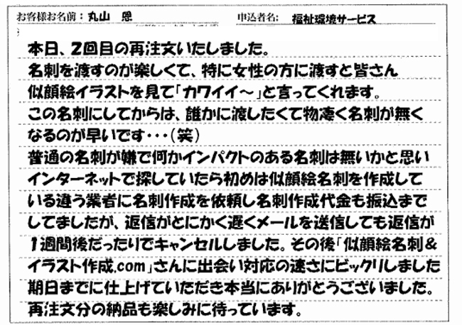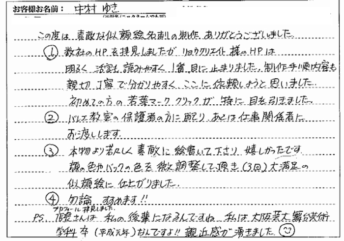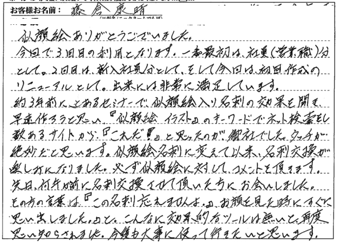 仕上がりの似顔絵もよく出来ていて(ちょっと出来過ぎ?)友達に見せたら、突っ込まれそうですけど(笑)、初めて見る方への印象としてはとてもいい感じに仕上がっていると思います。似顔絵に負けないよう頑張ります!!