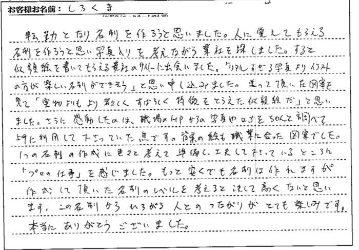 HPに載っていたサンプルも良かったですし、修正回数に制限がないのも安心感がありました。どういう依頼が「あいまいで困る」のか、料金加算されるのか等々、具体的に載っていたので依頼しやすかったです。