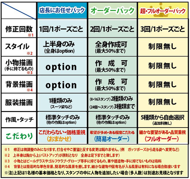 | ● 全身描画 :+500円 その他optionがかかるケース ※店長にお任せパックをご選択頂いている場合のみ全身描写はoptionとなります。 ※修正回数をオーバーされる場合は1回ごとに付き+1,000円(税抜)加算されます (修正は微調整のみで大きな変更やお写真差し替え、比較案の提出などは出来かねます) ※原則途中でのプラン変更はできません。どうしても希望な場合は金額が変動します ※オーダーパックの場合は個数の1/2までは全身作成が可能です。 (例:16個数ご選択の場合は内8個までは全身描写が可能です) |